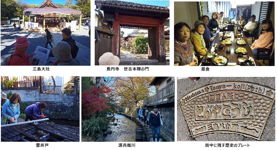 天気予報が気になる日が続きましたが、なんとか雨を避けて決行することができました。総勢10人で、三島ふるさとガイドの会の方の案内のもと「水の都三島」の町歩きを楽しみました。最初に向かった白滝公園で溶岩ドームと湧き水の説明を受けたのち、桜川沿いの文学の道を三島大社に進みました。大社の宝物館で学芸員の方の説明を受けたのち、狭い路地を三島暦師の舘に進みました。旧東海道では問屋小路のプレートを発見し、樋口本陣、世古本陣の間口の広さを実感しました。広小路の「時の鐘」の前で、この鐘の云われの説明を受けて終了。広小路近くのお洒落なお店でランチを取り解散となりました。近くでありながら意外に知らない三島をたくさん発見できた研修でありました。
