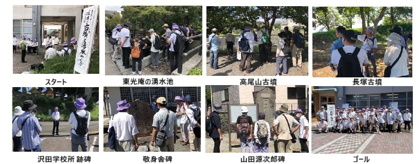 ウォークの距離は、約4km、坂道あり。東光庵の湧水→高尾山古墳→金岡小学校跡碑→江原素六墓所→長塚古墳→沢田学校所跡碑→敬身舎・甲子塔碑→山田源次郎碑→明治史料館の湧水のコースを、102名参加、沼津の気温30度のなか、皆さん最後まで歩かれ、本当にありがとうございました。